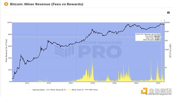 隨著礦工從交易手續費中獲得的收入增加,減半事件在塑造礦工激勵機制中的重要性可能會降低。如果交易手續費占礦工收入的比重越來越大(如下圖中黃色陰影區域所示),礦工可能會對區塊獎勵減少50%的影響不那么擔憂(區塊獎勵收入在下圖中以藍色陰影區域表示)。這一轉變表明,減半事件對礦工行為以及Bitcoin價格的主導影響可能會隨著時間的推移而減弱。