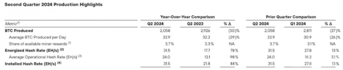 Bitcoin減半事件每四年發(fā)生一次,礦工處理交易獲得的獎勵減少一半。本次減半事件對整個BitcoinMining行業(yè)產(chǎn)生了巨大影響,使得礦工們難以適應(yīng)新環(huán)境。Marathon Digital也不例外,其Bitcoin產(chǎn)量下降30%,從去年同期的2,926 BTC降至2,058 BTC。