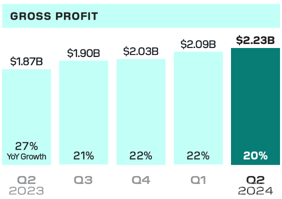 Block的總毛利潤在一年內(nèi)增長了20%,達到22.3億美元。2024年第二季度,普通股股東可獲得的凈利潤達到1.95億美元,高于去年的1.02億美元。