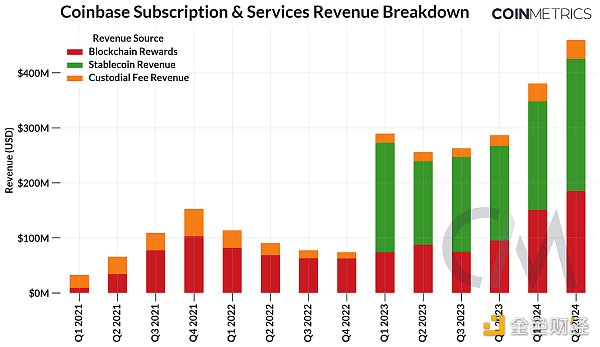 Coinbase的2024年第二季度收益顯示收入來源發(fā)生了變化,交易收入環(huán)比下降27%,但訂閱和服務(wù)收入環(huán)比增長(zhǎng)17%,其中穩(wěn)定幣收入是最大的來源。