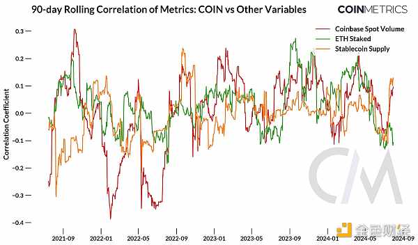 COIN收益與關(guān)鍵指標(biāo)之間的90天滾動(dòng)相關(guān)性顯示出顯著的變化,反映了Crypto市場(chǎng)和與Coinbase業(yè)務(wù)相關(guān)的指標(biāo)的動(dòng)態(tài)性質(zhì)。在Coinbase作為一家上市公司的早期階段,COIN收益與交易所的現(xiàn)貨交易量呈現(xiàn)出最高的正相關(guān)和負(fù)相關(guān)(+0.3至-0.4),表明其對(duì)投資者的最初重要性。然而,隨著時(shí)間的推移,它與穩(wěn)定幣供應(yīng)和ETH質(zhì)押量變化的關(guān)系也變得越來越突出,盡管這種關(guān)系仍然很弱,這表明投資者的注意力正在逐漸轉(zhuǎn)向新的收入來源。$COIN與市場(chǎng)回報(bào)之間的相關(guān)性