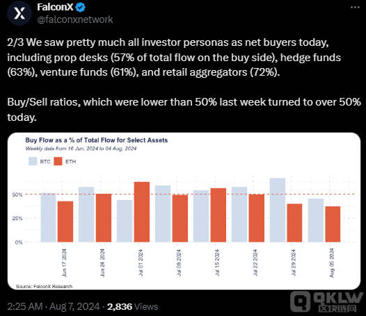FalconX的推文顯示,自營交易柜臺、對沖基金、風險投資基金和零售聚合商都在積極買入Bitcoin和Ethereum。其中,自營交易柜臺占總購買流量的57%,對沖基金占63%,風險投資基金占61%,零售聚合商占72%。
