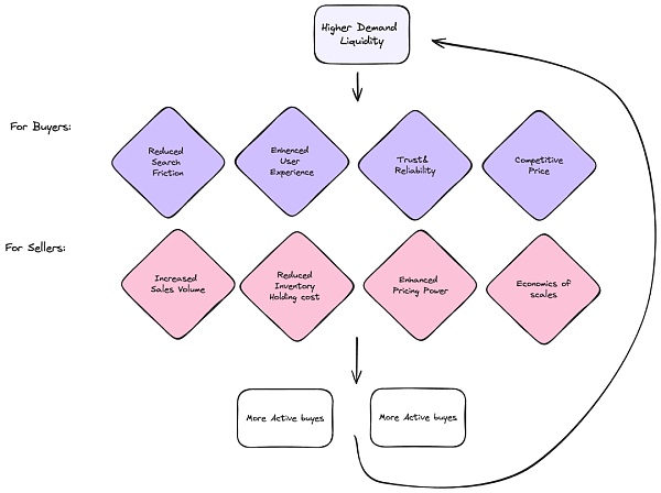 2.需求的復(fù)合增長效應(yīng)(CompoundNatureofDemand):在一個成功的Marketplace平臺上,需求的增加應(yīng)能夠引發(fā)進(jìn)一步的需求增長,從而形成一個自我強(qiáng)化的飛輪。當(dāng)平臺上的需求增長時,隨之而來的交易活動要能夠迅速激發(fā)供應(yīng)的增長響應(yīng),這種響應(yīng)不僅能提高產(chǎn)品的多樣性和質(zhì)量,還能提升用戶體驗,乃至對平臺的信任以達(dá)成品牌效應(yīng)嗎,進(jìn)一步驅(qū)動網(wǎng)絡(luò)效應(yīng),使得平臺的整體價值持續(xù)提升。只有高效地實現(xiàn)這種飛輪效應(yīng),Marketplace平臺才能通過持續(xù)改進(jìn)和創(chuàng)新,不斷適應(yīng)和滿足用戶的需求,從而保持長期的競爭優(yōu)勢。
