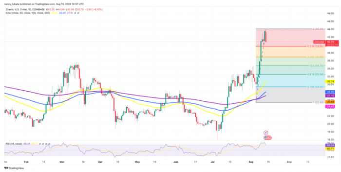 Wilcox在8月10日的博客中提到,Zcash需要從工作量證明(PoW)機(jī)制切換到PoS,以提高其隱私和安全性。盡管當(dāng)前價(jià)格接近44美元的強(qiáng)阻力位,ZEC的RSI值已高于70,顯示出超買(mǎi)狀態(tài),可能面臨回調(diào)風(fēng)險(xiǎn)。