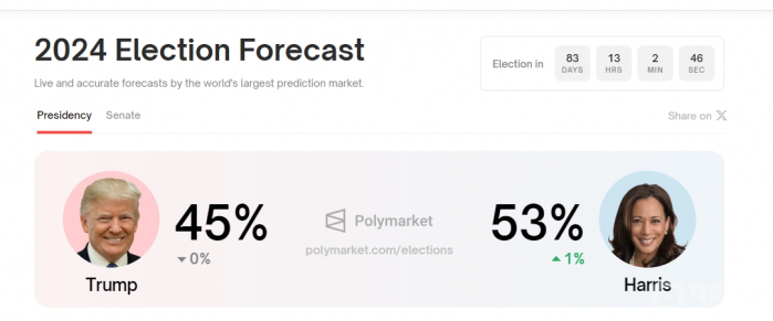 Polymarket 數(shù)據(jù)顯示,哈里斯的勝率已上升至 53%,領(lǐng)先特朗普 8%。自從拜登退選,哈里斯成為民主黨總統(tǒng)候選人后,她的支持率一路飆升,而特朗普的勝算則從 7月中旬的70% 急劇下降至 45%。