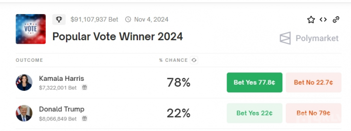 此外,在2024年民調(diào)(Popular Vote Winner 2024)中的預(yù)測顯示,哈里斯最終勝選的概率更是高達(dá) 78%,而特朗普只有 22%。