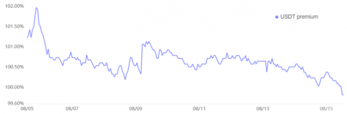 分析cn市場對穩(wěn)定幣的需求可以進(jìn)一步理解當(dāng)前Bitcoin的市場狀況。通常情況下,強勁的零售需求會推動穩(wěn)定幣的交易價格較官方美元匯率溢價2%或更多。最近數(shù)據(jù)顯示,8月15日,Tether(USDT)在cn的交易價格下跌0.2%,顯示出對該crypto的需求減弱。與8月6日的2%溢價相比,市場情緒顯著轉(zhuǎn)變。