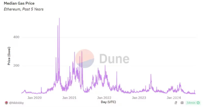 Ethereum網絡的交易費用近期出現了顯著下降,從3月份的83.1gwei下降至本周的0.6gwei,降幅超過95%。