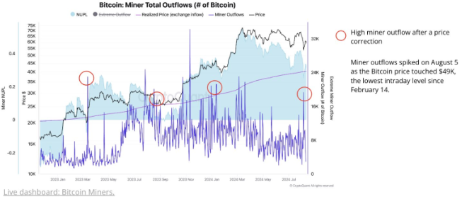 CryptoQuant也表達(dá)了對(duì)礦商現(xiàn)狀的憂(yōu)慮。根據(jù)該機(jī)構(gòu)的最新數(shù)據(jù),Bitcoin礦工的盈利壓力達(dá)到了今年以來(lái)的最低點(diǎn):“上周我們觀察到礦工‘投降’的跡象,8月5日Bitcoin流出量達(dá)到1.9萬(wàn)枚,是自今年3月以來(lái)的最高值。”