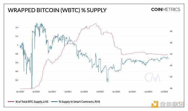 WBTC是目前最大的封裝資產之一,市值為90億美元。其供應量為15.4萬,占BTC當前供應量的0.8%,占Ethereum智能合約供應量的67%。