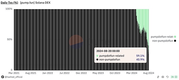 Pump.fun的影響力可以通過其相關(guān)Tokens在DEX上的主導(dǎo)地位來觀察,目前這些Tokens占交易量的約60%。然而,雖然輕松發(fā)行Tokens對用戶有利,但也吸引了不良行為者。根據(jù)Protos.com的數(shù)據(jù),在170萬個memecoin中,只有41個達(dá)到了并維持了較高的市值,這意味著"成功"的幾率接近0.00002%。