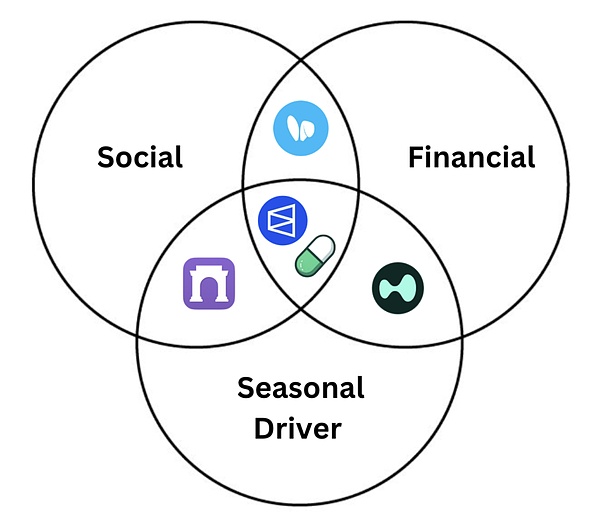 金融元素為協(xié)議提供了它需要的"價值",以啟動參與經(jīng)濟(jì)并讓用戶堅(jiān)持使用該系統(tǒng)。社交元素在現(xiàn)有金融元素的基礎(chǔ)上提高用戶粘性,創(chuàng)造一個不斷拉新的社區(qū)。季節(jié)性驅(qū)動因素推動了已經(jīng)在社交和金融元素方面表現(xiàn)出色的協(xié)議的持續(xù)增長。