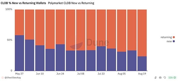 除了評論區(qū),該主題的百分比經(jīng)常被用作不同媒體關(guān)于選舉相關(guān)新聞的頭條,這反過來吸引了更多用戶加入該平臺。僅在上個月,Polymarket就吸引了65,000名新用戶,由于更多有關(guān)頭條新聞的市場出現(xiàn),隨著選舉關(guān)注度的增加,預(yù)計(jì)增長將繼續(xù)。