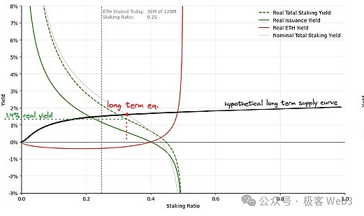 綜合考慮需求和供應等因素,我們可以推測出ETH質押能維持的長期均衡狀態。前面我們提到,當質押參與率較低時,需求曲線表現出明顯的傾向性,但對于長期內可能達到的具體質押比例沒有明確結論。