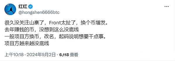 近年來(lái),Blockchain項(xiàng)目改名已經(jīng)成為一種趨勢(shì),近期包括MakerDAO更名為Sky Protocol、MATIC更名為POL、Fantom更名為Sonic Labs等,但通常情況下,這些項(xiàng)目都會(huì)在Tokens置換過(guò)程中給予投資者等值的Tokens。然而,最近Frontier項(xiàng)目的Tokens置換操作卻引發(fā)了廣泛的社區(qū)爭(zhēng)議。盡管項(xiàng)目方將Tokens總量增發(fā)了四倍,但投資者卻只獲得了按原比例置換的Tokens,這一操作引發(fā)了社區(qū)的強(qiáng)烈不滿(mǎn)。