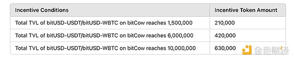 獎勵方式:bitUSD鑄造達到目標以及在bitCow上為bitUSD池子增加流動性,兩種方式激勵詳情如下圖。流動性激勵金將根據用戶在Merlin鏈上獲得的bitPoints進行分配,用戶獲得的積分越多,獲得的Tokens激勵就越多。