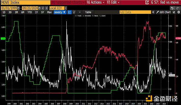 我將要展示的第一張圖表是MOVE指數(白色),該指數衡量美國債券市場的波動性與聯邦基金上限利率(綠色)的關系。正如你所知,我認為數量比價格更重要,但在這種情況下,使用價格來呈現圖景卻極其清晰。