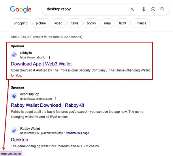 今年3月,慢霧安全團(tuán)隊(duì)和RabbyWallet團(tuán)隊(duì)披露了一種利用Google廣告進(jìn)行釣魚(yú)的攻擊手法。具體來(lái)說(shuō),RabbyWallet團(tuán)隊(duì)并未購(gòu)買(mǎi)任何Google廣告,然而假?gòu)V告卻跳轉(zhuǎn)到了真正官網(wǎng)。從Google搜索關(guān)鍵字情況來(lái)看,排在前兩位的搜索結(jié)果都為釣魚(yú)廣告,然而第一條廣告的鏈接卻很反常,它顯示的是RabbyWallet的官方網(wǎng)站地址rabby[.]io,通過(guò)跟蹤發(fā)現(xiàn),釣魚(yú)廣告有時(shí)會(huì)跳轉(zhuǎn)到真正官方地址rabby[.]io,而在多次更換代理到不同地區(qū)后,則會(huì)跳轉(zhuǎn)到釣魚(yú)地址rebby[.]io,并且該釣魚(yú)地址會(huì)更新改變。分析發(fā)現(xiàn),關(guān)鍵操作在于釣魚(yú)團(tuán)伙利用了Google自家的Firebase短鏈接服務(wù)的302跳轉(zhuǎn)來(lái)欺騙谷歌的展示。類(lèi)似的釣魚(yú)套路還出現(xiàn)在各種聊天軟件上。以TG這款聊天軟件為例,當(dāng)聊天時(shí)發(fā)送一個(gè)URL鏈接,TG后臺(tái)會(huì)抓取URL鏈接域名、標(biāo)題和圖標(biāo)進(jìn)行預(yù)覽展示。