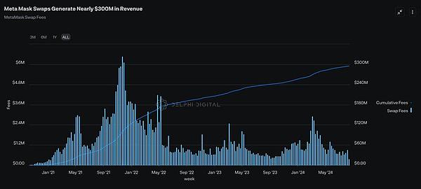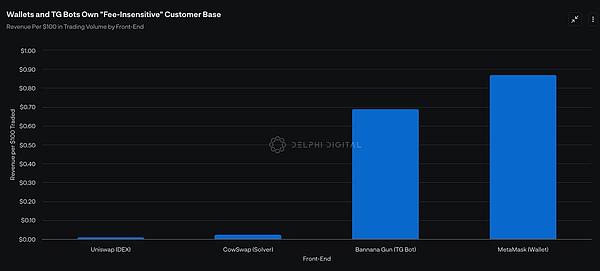 展望未來,如果錢包能夠利用上述趨勢并繼續(xù)掌握最終用戶關系,我預計錢包內的交換將繼續(xù)蠶食其他前端的市場份額。更重要的是,即使它們僅能將市場份額提高5%,由于錢包交換每交易100美元產(chǎn)生的收入幾乎是DEX前端的100倍,這一增長也將產(chǎn)生巨大的影響。