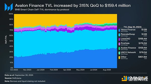 在前六大協(xié)議中,除VenusFinance外,唯一TVL有所增長(zhǎng)的是AvalonFinance,這是一個(gè)在多個(gè)網(wǎng)絡(luò)上為基于BTC資產(chǎn)提供借貸服務(wù)的協(xié)議。AvalonFinance于5月在BNBSmartChain上推出借貸市場(chǎng),并迅速獲得了8位數(shù)的TVL。7月31日,AvalonFinance被宣布為BNBIncubationAlliance第二輪的獲勝者之一,這使其快速進(jìn)入了BNBChain的最有價(jià)值建設(shè)者(MVB)計(jì)劃。在這一宣布之后,AvalonFinance的TVL迅速超過(guò)1億美元,并在季度末達(dá)到1.594億美元(環(huán)比從3,840萬(wàn)美元增長(zhǎng)315%)。