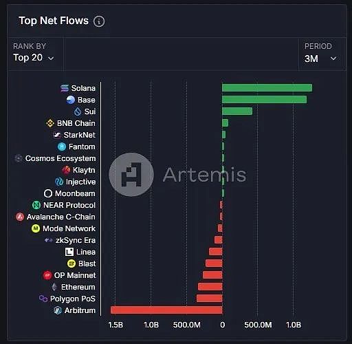 譯者按:憑借AI發幣平臺Clanker及Virtuals的爆火,行業對Base生態的關注出現「暴漲」。當地時間11月26日,Base上的交易量直線拉升,達到約 1136萬筆,為歷史上首次單日交易量突破1000萬筆(其中有超一半的交易被撤回。Base協議負責人 JessePollak 回應稱,交易被撤回系搶跑機器人試圖瘋狂捕獲MEV所致,并計劃進一步擴展Base)。此外,近期Solana生態Memecoin龍頭pump.fun因直播一事遭社區「轟炸」,一時間資金似有向Base等生態流動的跡象。Artemis 數據顯示,Base最近1個月的鏈上資金流入達到了8.15億美元,在所有鏈中排名第一,而作為對比,Solana的資金凈流入僅3.04億美元。所以,Baseseason要來了嗎?