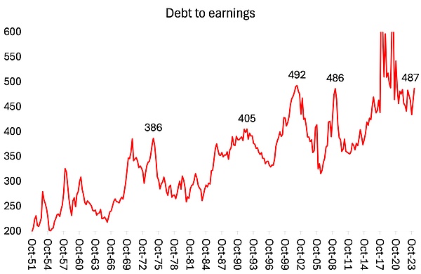 而且這種泡沫的支撐非常薄弱。美國股市推動著世界股市,而推動美國股市的只有七只股票:即所謂的七大股票。對于絕大多數(shù)美國公司而言,除了蓬勃發(fā)展的能源行業(yè)、社交媒體和科技行業(yè)之外,情況并不樂觀。標(biāo)普500指數(shù)成分股公司的每股自由現(xiàn)金流三年來沒有增長(見下圖紅線)。利潤增長預(yù)測與實際增長情況大相徑庭。