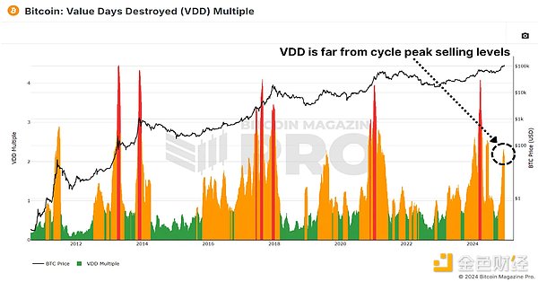 需要注意的一點是,BitcoinETF和衍生品的使用日益增加。投資者可能正在從自我托管轉(zhuǎn)向使用ETF,以追求便利性和稅收優(yōu)勢,這可能會對SOPR數(shù)值產(chǎn)生影響。6、銷毀價值天數(shù)(VDD)