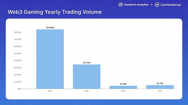 Web3游戲板塊在2024年實現強勁增長,但相較其他加密板塊表現遜色。根據FootprintAnalytics數據,游戲Tokens市值年末達到318億美元,較上年增長60.5%。雖然該板塊在3月創下474億美元的年內高點,但仍顯著低于2021年11月創下的1,141億美元歷史高位。