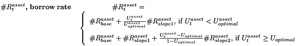 盡管存在兩種利率模型(穩(wěn)定型和浮動(dòng)型),但是其模型計(jì)算都類似于一個(gè)拐點(diǎn)型模型。在拐點(diǎn)最優(yōu)利用率下的slope1和超過最優(yōu)利用率的slope2分段計(jì)算,且在這個(gè)條件下也分為固定利率模型和可變利率模型。