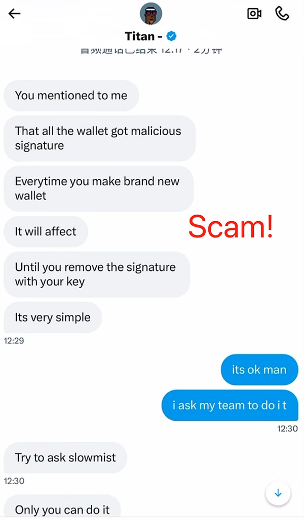 用戶在察覺異樣后并未配合,不過騙子沒有放棄,為了進一步施壓并取信于人,騙子建議用戶去咨詢慢霧安全團隊。一些警惕性不高的用戶,聽到對方愿意請安全公司驗證,可能會因此放松警惕,誤以為對方不是騙子。而騙子則往往賭定用戶不會真的去核實,甚至在行騙過程中直接 @SlowMist_Team,試圖利用安全公司為自己背書。