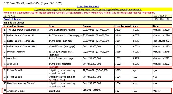 值得注意的是,這份長達234頁的財務文件中,多達上百項收入屬于不足201美元以內的款項,但仍然被詳細列出。與之相對,美國前總統拜登在2024年提交的財務表格只有11頁,主要收入來源為銀行和退休賬戶等傳統來源,而民主黨總統候選人哈里斯的財務表格也只有15頁。