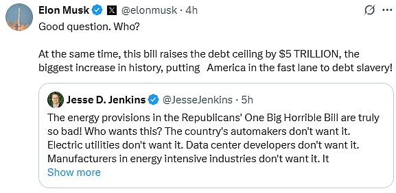 同日,馬斯克猛烈抨擊特朗普政府數萬億美元級別的最新稅改法案,他在社交媒體上X上稱,削減電動車和其他清潔能源補貼,對美國將是極具破壞性的: