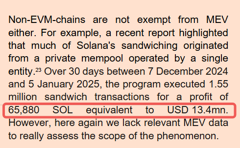 歐洲證監局(ESMA)2025年報告統計,僅2024/12–2025/1的30天里,夾擊(sandwich)交易就達155萬筆、利潤65,880SOL(約1,340萬美元);(esma.europa.eu)