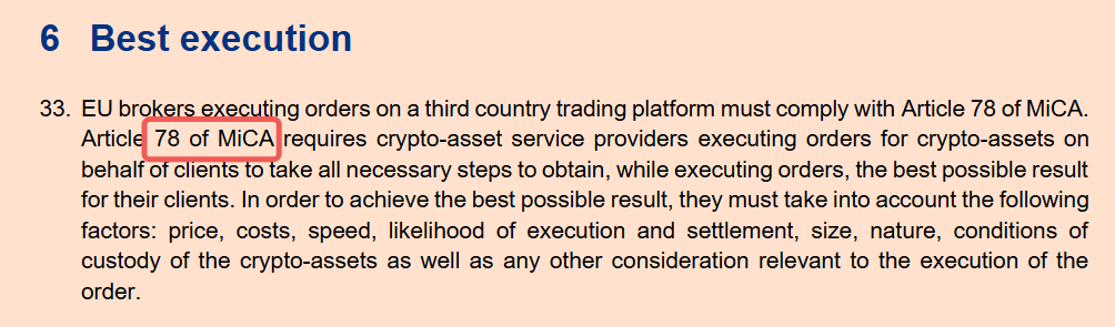 原則先行(同一合規圈層): 在單一司法轄區的合規平臺/經紀/聚合器之間,確立“不得穿透更優公開價格/凈價”的明確義務。什么叫“凈價”?不只看屏幕上的名義價,還要把費用、返傭、滑點、Gas、失敗重試成本都算進去。歐盟 MiCA第78條 已經把“最佳結果”寫成法定清單(價格、成本、速度、執行與結算可能性、規模、托管條件等);這一原則性口徑,完全可以成為“加密版防穿透”的錨。(esma.europa.eu, wyden.io)