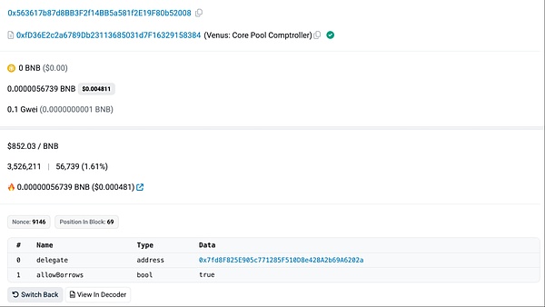 受害用戶完成委托后,攻擊者立即發(fā)起攻擊,通過 Lista閃電貸借入約285個(gè)BTCB,并動(dòng)用其自有的21.18個(gè)BTCB與205,000個(gè)XRP。隨后,攻擊者為受害用戶在Venus上歸還了約306.89個(gè)BTCB與152,673.96個(gè)XRP的貸款。
