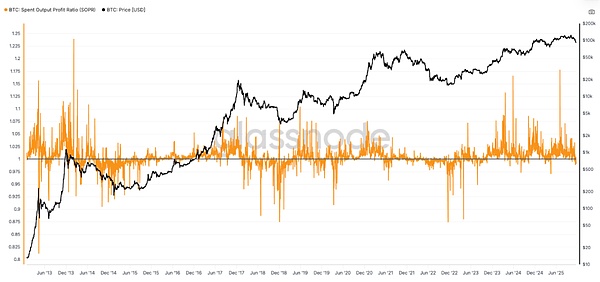 RHODL是衡量短期持幣者(1周)與中長期持幣者(1–2年)之間“已實現價值”比值的指標,用于識別市場頂部風險。歷史上,該指標進入極高區域(紅色帶)時,常對應牛市泡沫頂點(如2013、2017)。2021-2022年,RHODL再度沖高,雖未突破歷史極值,但提示市場結構進入后期。如今該指標也進入周期性高點,在某種程度上也預示著價格處于頂部。