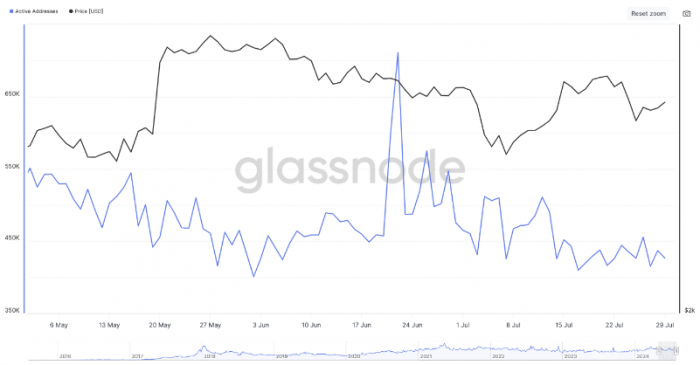 ETH下跌的原因眾多,其中包括2024年美國(guó)EthereumETF的資金流出。此外,Ethereum的網(wǎng)絡(luò)活動(dòng)在過去一個(gè)月有所下降。Glassnode的數(shù)據(jù)顯示,Ethereum每日活躍地址(DAA)數(shù)量從6月22日的711,078個(gè)地址減少到7月10日的426,472個(gè)。