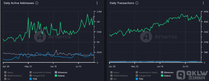 雖然Ethereum仍然是第1層領(lǐng)域的主導(dǎo)網(wǎng)絡(luò),但Solana最近在鏈上活動(dòng),總費(fèi)用以及其他鏈上指標(biāo)方面贏得了市場(chǎng)份額。Artemis數(shù)據(jù)顯示,Solana在每日活躍地址數(shù)和每日交易量方面占據(jù)了第一層細(xì)分市場(chǎng)的主導(dǎo)地位。自5月17日以來,開放網(wǎng)絡(luò)(TON)和Ethereum在DAA方面勢(shì)均力敵,當(dāng)時(shí)TON首次超越Ethereum,并于6月初取得進(jìn)展。