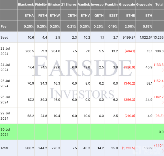 新推出的現(xiàn)貨ETH ETF自7月23日開始交易以來,資金流入超過12.3億美元。這些資金流入被灰度Ethereum信托(ETHE)超過17.23億美元的流出所抵消。Farside Investors的數(shù)據(jù)顯示,目前EthereumETF現(xiàn)貨凈流出總額為4.4億美元。