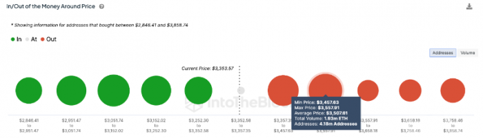 以太基基金的持續(xù)流出反映了負(fù)面的技術(shù)背景。以太幣最近的復(fù)蘇嘗試因3500美元以上的供應(yīng)擁堵而被拒絕,這表明該區(qū)域是ETH復(fù)蘇之路上的重要障礙。IntoTheBlock的數(shù)據(jù)強(qiáng)化了該阻力區(qū)的重要性。其In/Out of the Money around Price (IOMAP)模型顯示,該區(qū)域價(jià)格范圍為3457美元至3557美元,其中418萬個(gè)地址購買了約193萬個(gè)ETH。