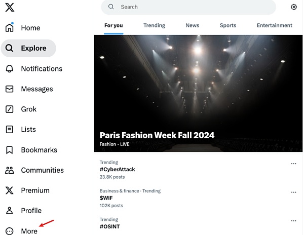 我們以 Web 端為例,打開 x.com 頁面后,點擊側邊欄的“More”,找到“Settings and privacy”選項,這里主要用于設置賬號的安全和隱私。